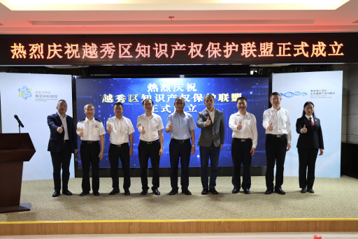 随后,举行越秀区知识产权保护联盟成立仪式。广东省知识产权保护中心、广东省海外知识产权保护促进会、广州市市场监管局(知识产权局)、越秀区政府、广州知识产权保护中心、广东省专利代理协会、广东技术师范大学、越秀区市场监管局(知识产权局)、越秀区人民法院、越秀海关等单位领导共同上台见证联盟正式成立。联盟成立后,将整合行政、司法、高校、行业协会等多方资源,构建一站式、全链条海外知识产权协同保护网络,为企业出海提供更强有力支撑。