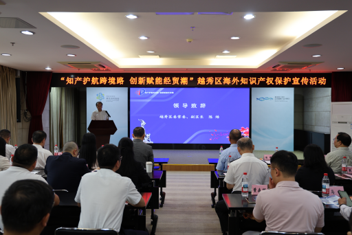 广东省知识产权保护中心副主任兼广东省海外知识产权保护促进会会长邱庄胜,广州市市场监督管理局(知识产权局)副局长万众,越秀区委常委、副区长陈烯,越秀区市场监管局(知识产权局)党组书记、局长、区“小个专”党委书记刘中等领导、嘉宾出席活动,越秀区内近100家进出口企业和重点外贸专业市场代表参加活动。