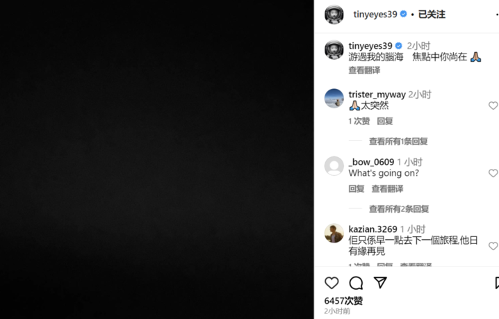 郑中基也发了一张黑色的图片,配文是来自《东京出没》的一句歌词。“游过我的脑海,焦点你尚在”。