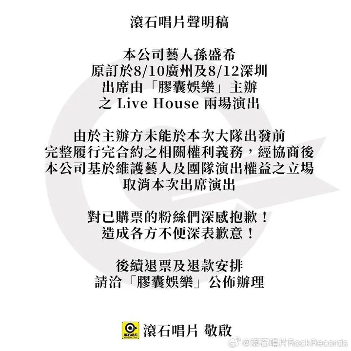 稍后,孙盛希所属的滚石唱片亦发表声明,宣布孙盛希取消本次演出,理由与艾怡良方一致。