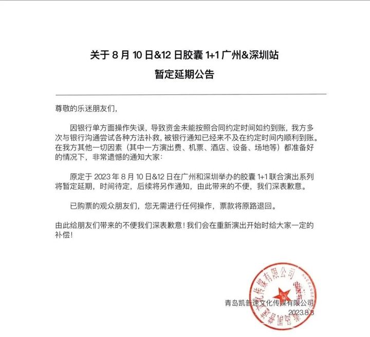 半小时后,主办方胶囊娱乐发文称,演出取消的原因为“银行单方面操作失误”,导致资金未能按照合同约定时间到账。主办方称,虽然多次与银行沟通尝试各种方法补救,但被银行通知已经来不及在约定时间内顺利到账。主办方表示,在“其他一切因素(其中一方演出费、机票、酒店、设备、场地等)都准备好”的情况下,遗憾宣布演出“暂定延期”,票款将原路退回,并表示会在“重新演出开始时给大家一定的补偿”,但该篇声明并未给出再行举办的日期或具体的补偿方案。