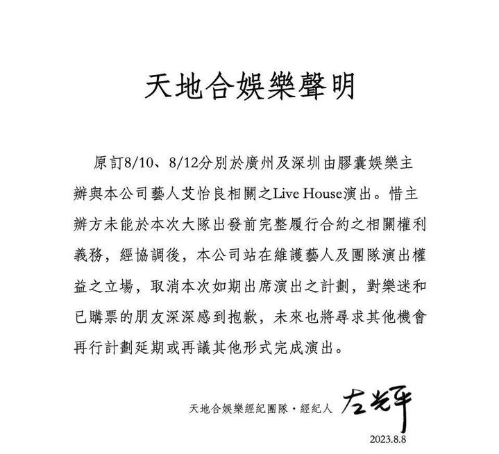 8月8日中午,先是艾怡良方在社交平台发布经纪公司声明:“惜主办方未能于本次大队出发前完整履行合约之相关权利义务,经协调后,本公司站在维护艺人及团队演出权益之立场,取消本次如期出席演出之计划。”